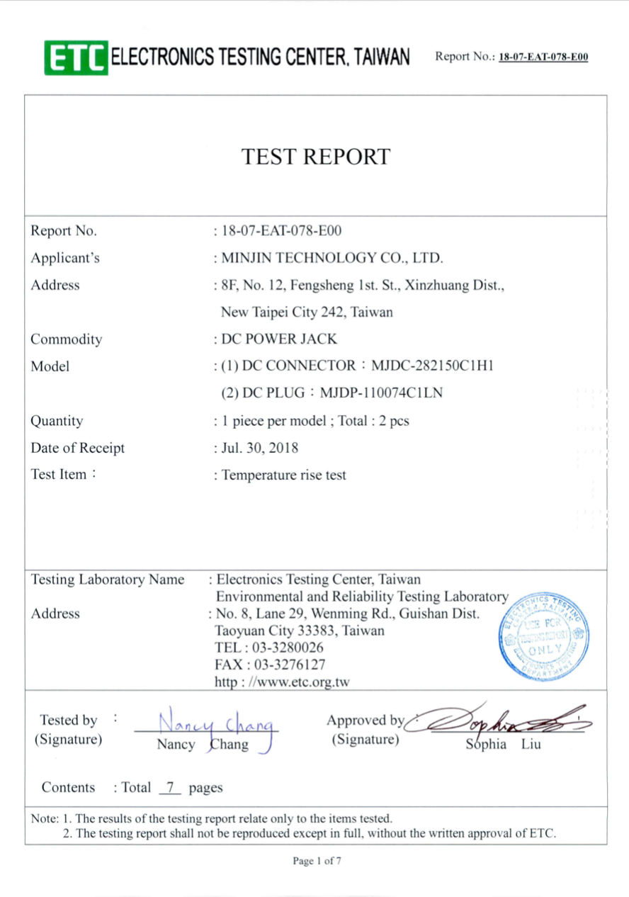 In 2018, MINJIN TECH used the most suitable meterial and effective design of positive and negetive electrod to create a leading power with the smallest volume in the market. The efficiency of DC POWER JACK with a large wattage can reach up to 580W, almost the maximum power at 600W. It has also been approved by the ETC, the Electrocnics Testing Center. becoming the number one brand requested by the leading E-sports.